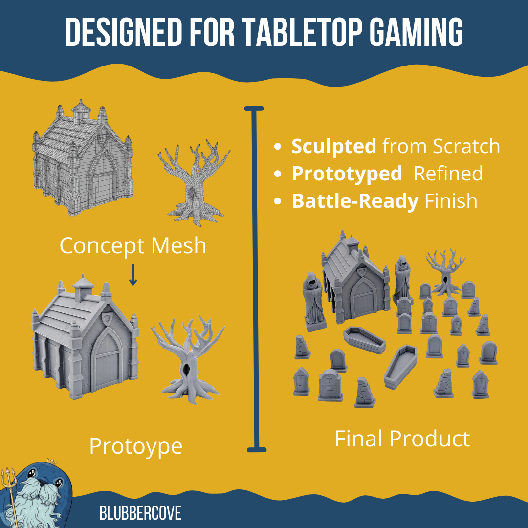 Cinematic battlefield? Halloween dungeon? Quick RPG setup? This graveyard scatter terrain pack drops instant atmosphere to any 28mm scale game — no assembly stress, straight to gaming!